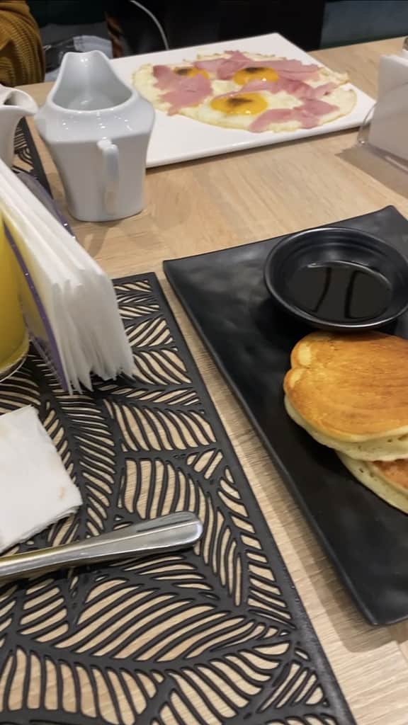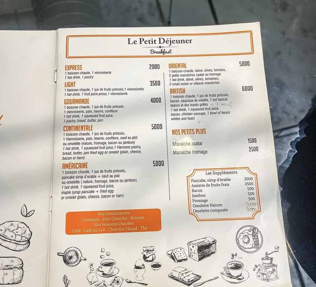 Nous avons opté pour la formule Continentale à 5000 frcs composée d’une boisson chaude, d’un jus de fruits préssés, des viennoiseries, du pain, du beurre, des pancakes au sirop d’érable, un oeuf au plat ou omelette (nature, fromage, bacon ou jambon).