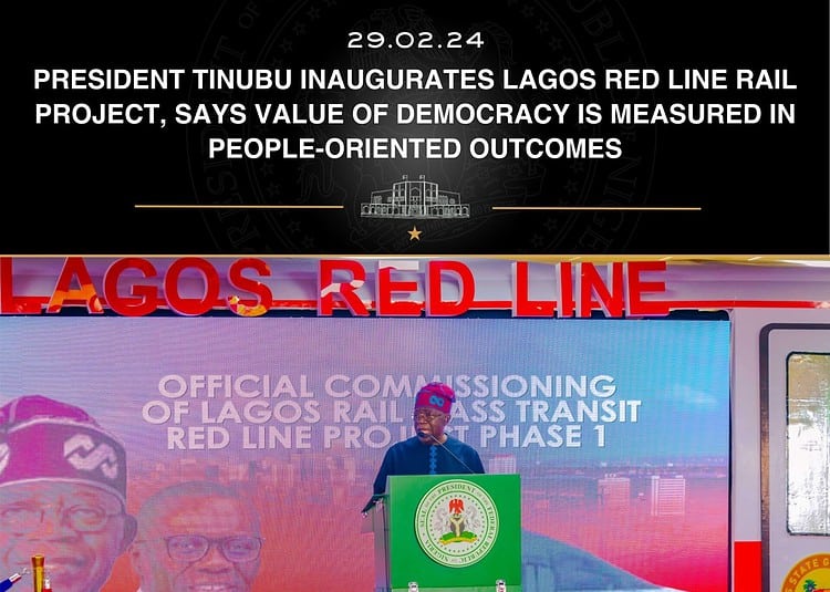 President Tinubu Inaugurates Lagos Red Line Rail Project, Says Value of Democracy is Measured in People-oriented Outcomes#StateHousePressRelease pic.twitter.com/tCcOQyEZX7
